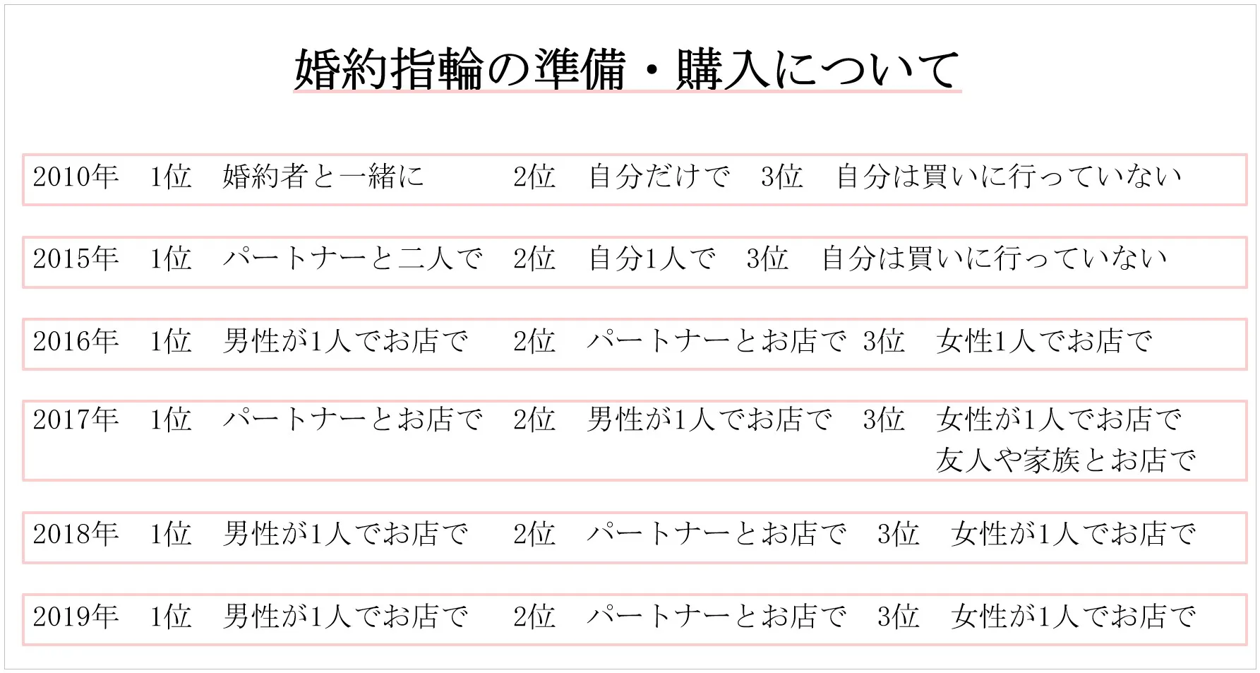 この結果から、よりプロポーズに対して真剣に取り組み、努力する男性が増加したと言えるのではないでしょうか。プロポーズがさらに大切な思い出と位置付けられていると考えられます。