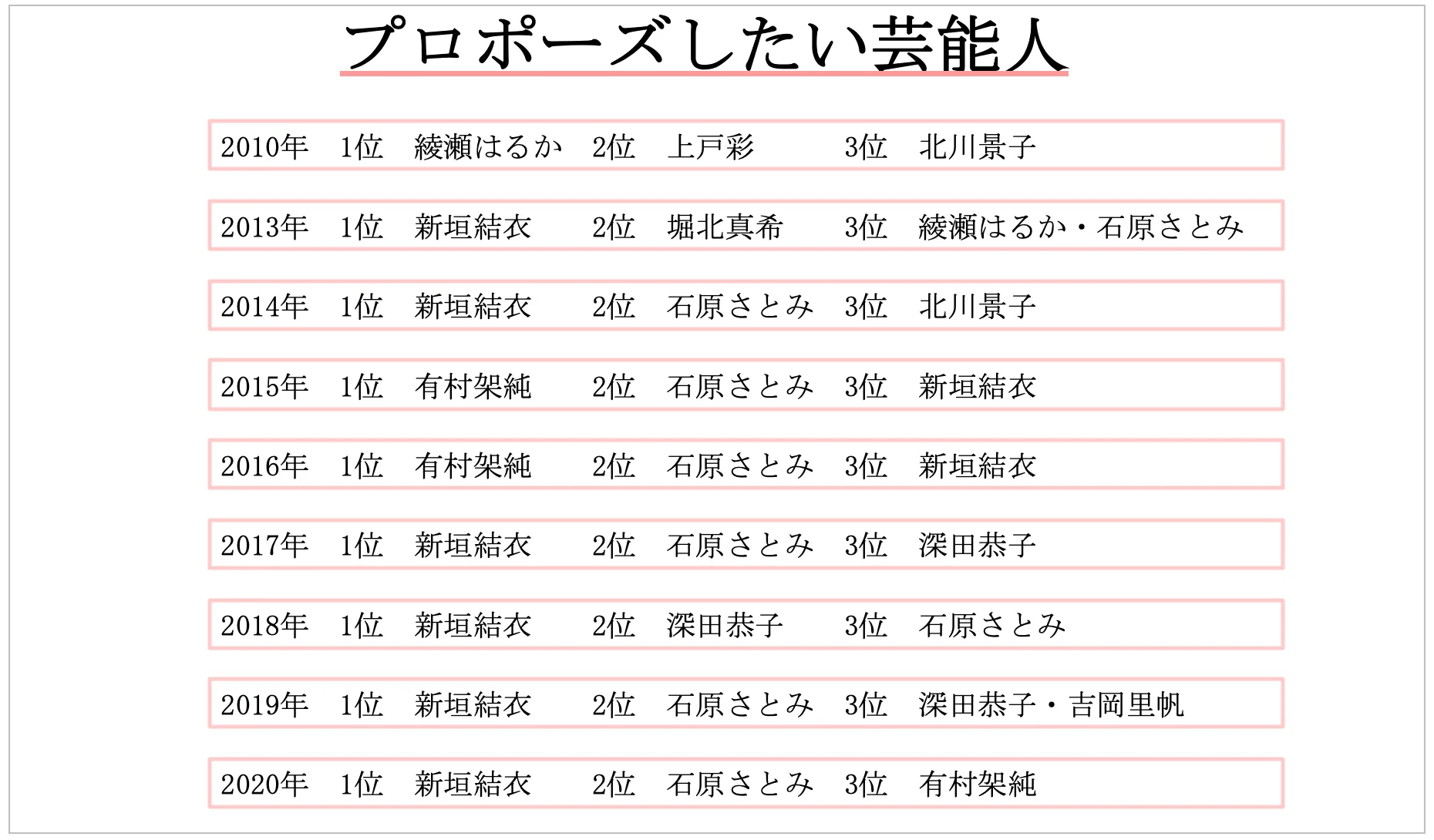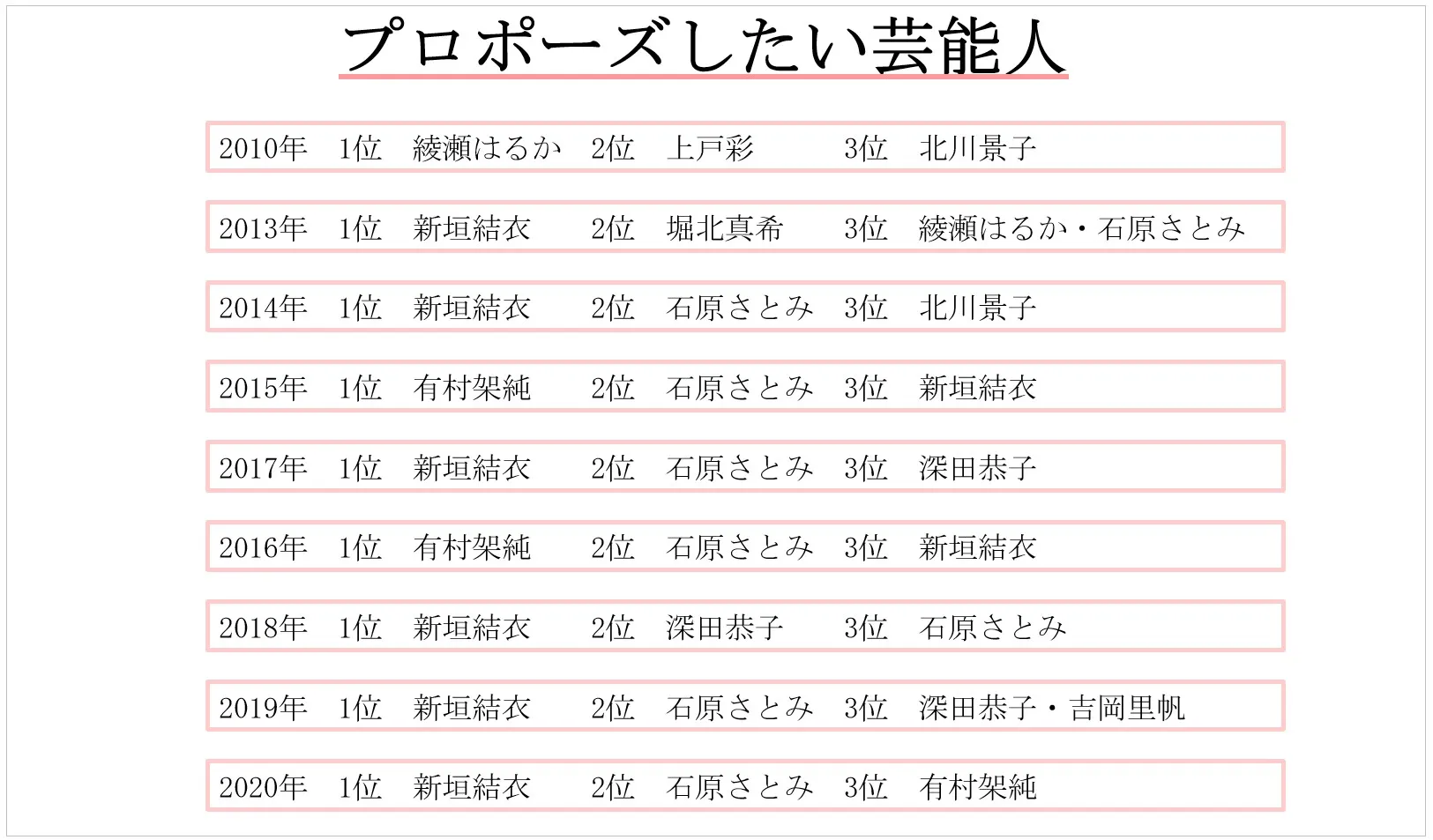 女性部門では、新垣結衣さんが例年安定した人気を獲得しています。2020年の調査でも1位を獲得し、4年連続の首位をキープしています。また、有村架純さんや綾瀬はるかさん、石原さとみさんが例年ランクインしており、男性部門に比べ大きな変動がないことがわかりました。