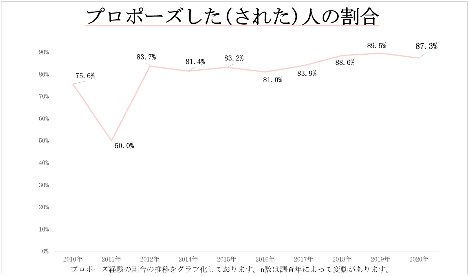 「プロポーズ」経験の有無に関する調査では、例年全体の7~8割の回答者が「はい」と回答していることがわかりました。近年では8割~9割の方がプロポーズをした(された)というデータも出ています。