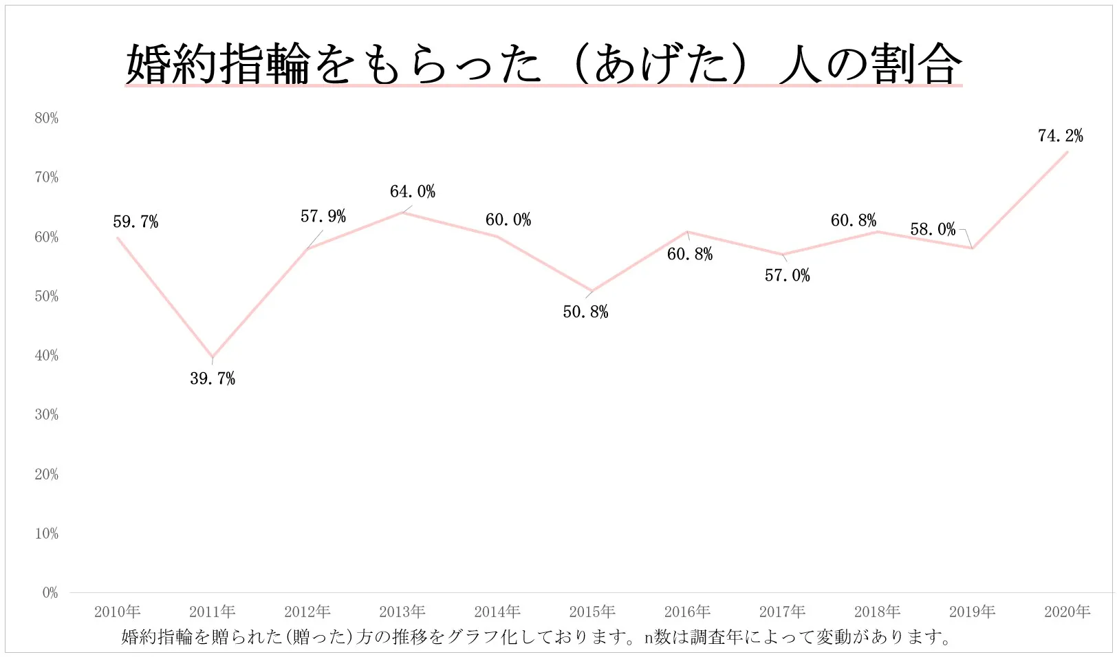 また「婚約指輪をもらいましたか(あげましたか)」という質問では、「はい」と答えた方が例年約6割と多くの人々が「プロポーズ」に際して婚約指輪をもらっている(あげている)ことがわかりました。2020年度調査では婚約指輪をもらった(あげた)人は7割以上と、より婚約指輪を重視する傾向。