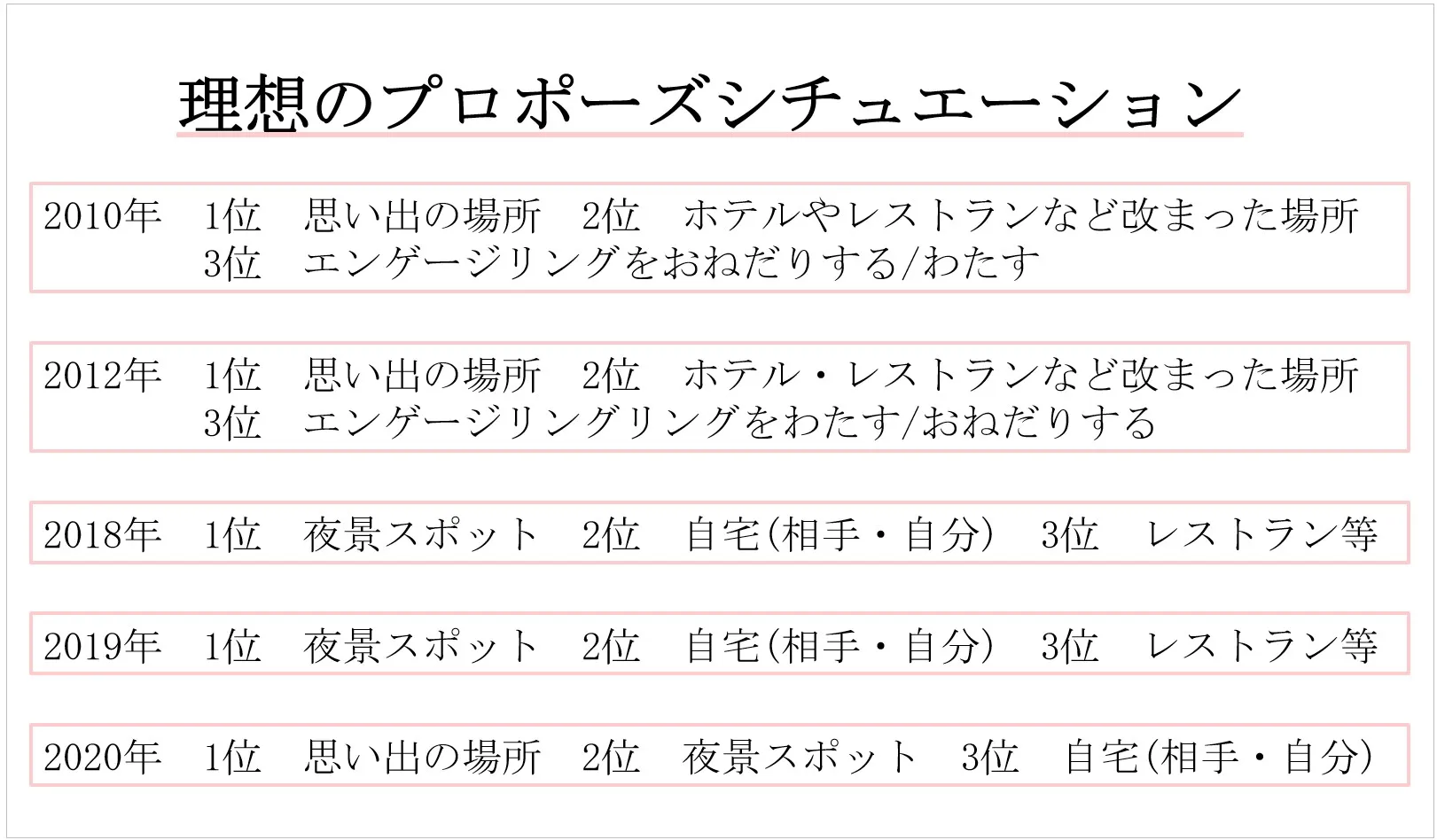 「理想のプロポーズの場所・シチュエーション」に関する設問では、「二人の思い出の場所」が2010年・2012年の調査では1位でしたが、近年では、「夜景スポット」や「自宅」がそれぞれ3割程度の支持を得ています。