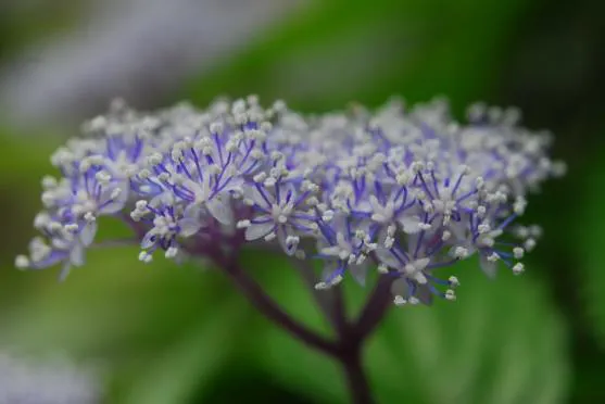 本州(関東以西)・四国・九州の山地に生える落葉低木で、高さは1m~1.5m、花は径5cmほどです。アジサイによく見られる大きな装飾花がないため、他の種に比べて派手さはないですが、代わりに甘い香りを放ち、花粉を運んでくれる昆虫たちを誘います。花色は、淡青紫色の優しい色合いで、株により花の色調が微かに違い、青色が濃いものから白に近いものまで様々な色合いがみられます。
