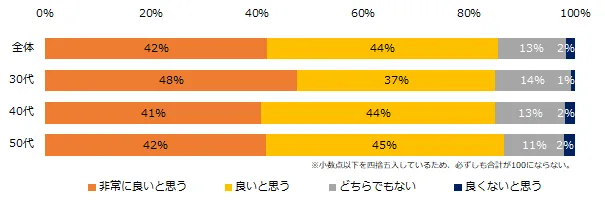 「”パワハラ防止法”についてご存知ですか?」と伺ったところ、76%が「知っている」(内容も含めて知っている:22%、概要だけ知っている:54%)回答しました。年代が上がるほど、認知度が上がっています。「”パワハラ防止法”についてどう思いますか?」と伺うと、86%が「良いと思う」(非常に良いと思う:42%、良いと思う:44%)と回答しました。
