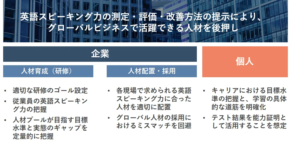このように、グローバルビジネスにおける英語活用と成果創出に向けて、英語スピーキング力の測定・評価・改善方法の提示を一気通貫したサイクルとして回すことが強く望まれていると考えられます。