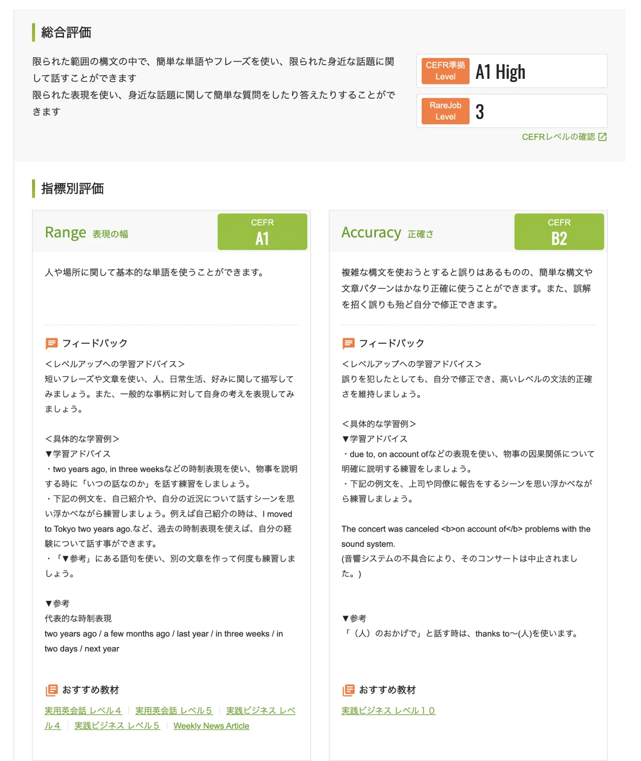 | 評価形式 | 総合評価:CEFR準拠(CEFR-J)レベル 、 指標別評価:CEFRが定義する6つの発話の質による評価項目に分けた評価 |