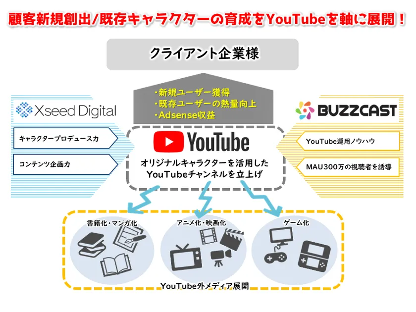 当事業は、BUZZCASTのYouTubeチャンネル運用力とクロシードデジタルのコンテンツ企画力・キャラクタープロデュース力を連携し、企業やブランドのキャラクタープロデュースを支援する効果的なソリューションパッケージを共同で提供していくものです。