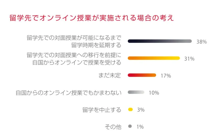 英語圏の多くの大学が授業を自国からオンラインで受講する方法を設けていますが、いわゆる「オンライン留学」でも構わないと答える学生はわずか10%にとどまりました。やはり、留学先に渡航して、対面授業を希望する学生が多く、授業が再開されるまで留学を延期する予定と答えた学生が38%で最も多くなりました。次いで、対面授業に移行する前提であれば、オンライン授業を受けると答えた学生が31%で2つ目に多い結果となりました。