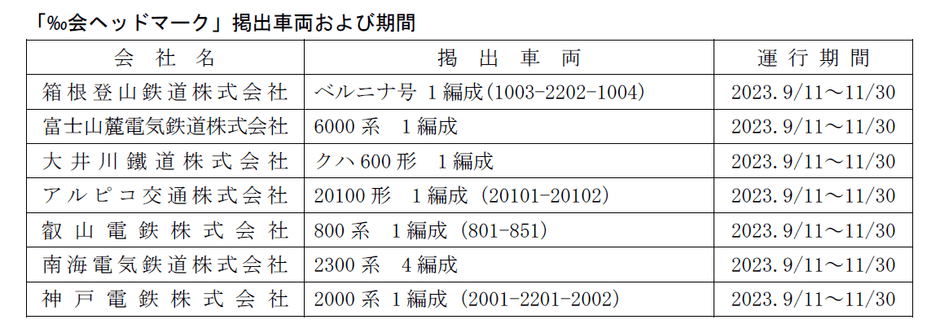 箱根登山鉄道株式会社、富士山麓電気鉄道株式会社、大井川鐵道株式会社、アルピコ交通株式会社、叡山電鉄株式会社、南海電気鉄道株式会社、神戸電鉄株式会社の7社による「全国登山鉄道‰(パーミル)会」では、2023年9月11日(月)から恒例の「‰会ヘッドマーク」掲出車両を各社で運行します。