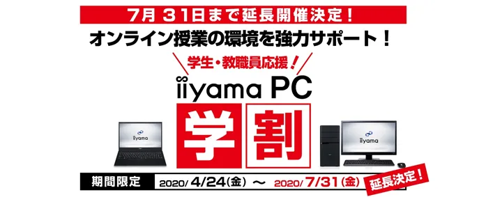 好評につき7月31日まで期間延長を決定! パソコン工房がオンライン授業/リモート学習を徹底サポート! 学生・教職員対象の「iiyama PC 学割」でパソコンをお得に買おう!