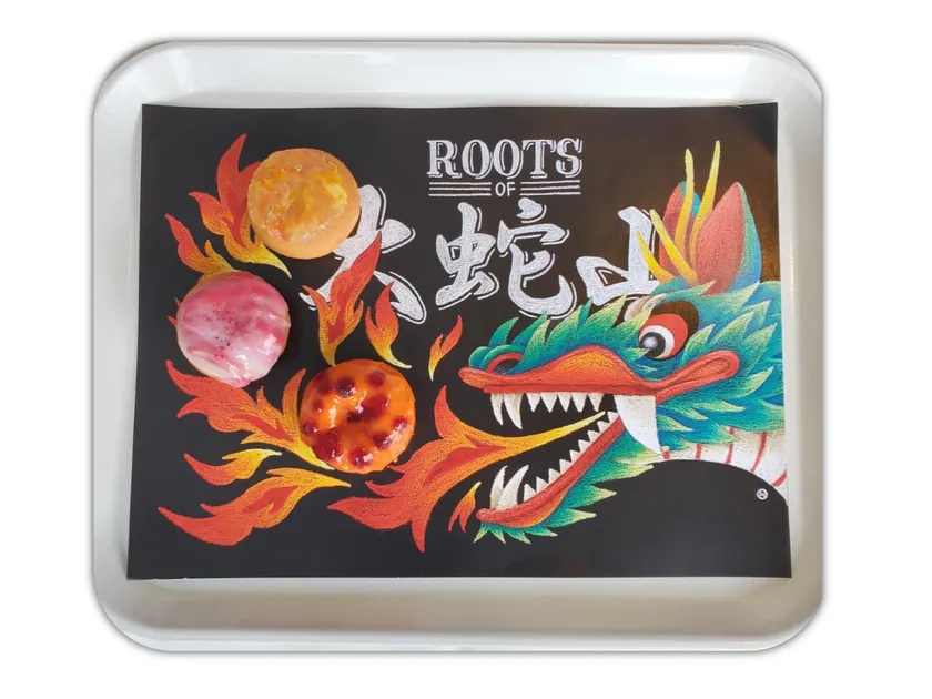 大蛇山ボール(カシスオレンジ仕立ての甘酸っぱいドーナツ)、大蛇山ピンク(ラズベリーと練乳のグレーズドーナツ)、大蛇山オレンジ(オレンジ、グレープフルーツを合わせたゼリー状のドーナツ)の3色のドーナツを大蛇山プレートで提供。