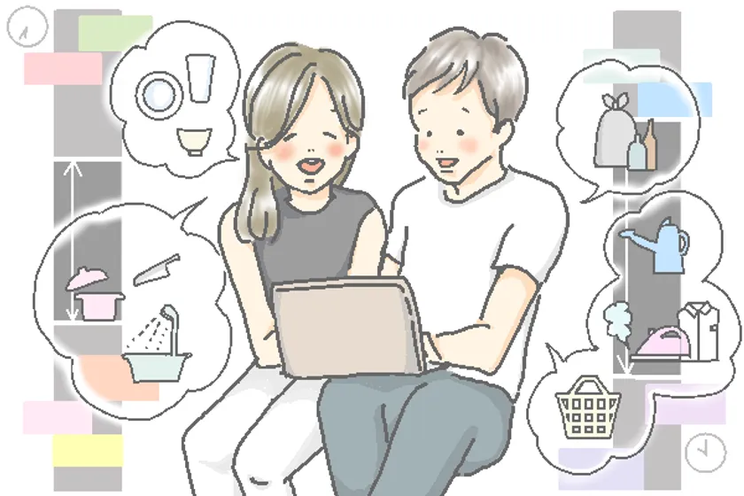 今回は共働き夫婦の家事分担についてさまざまなアンケート結果をリポートしましたが、まずはお互いに得意な家事や不得意な家事をすり合わせ、出社時間や帰宅時間などの働き方を踏まえた相談を。思っていることを正直に伝えたり、細かな点まで確認できる「家事の分担表」を作ったりするのもおすすめです。