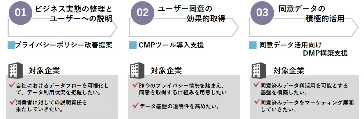”ELSI”に配慮したプライバシーポリシー改善提案などのラインナップを用意