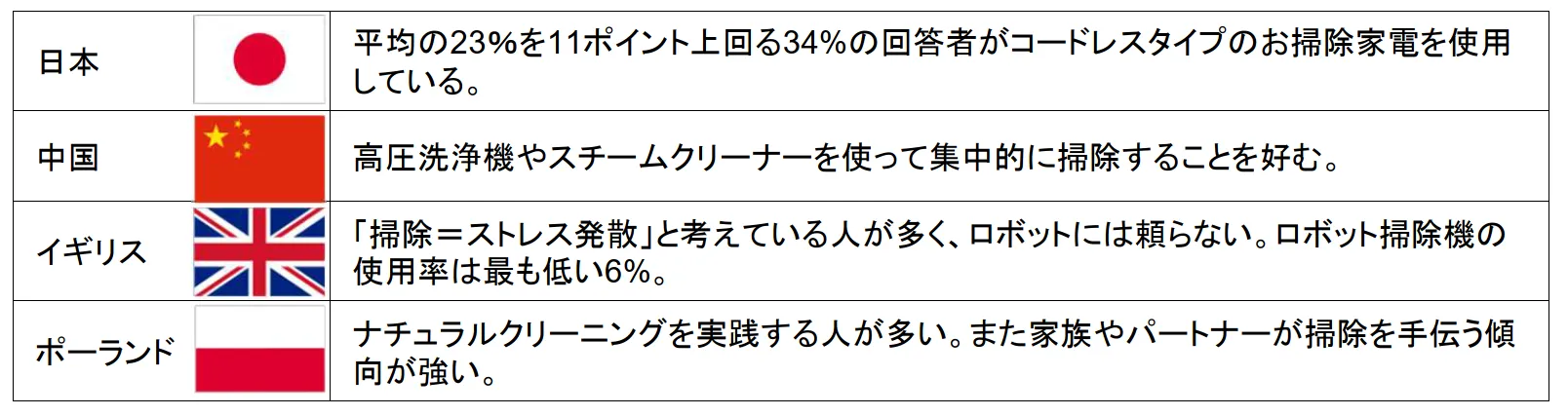 アンケート調査は3問で構成されており、各国の掃除に対する意識や時間、そして使用する掃除道具の違いが浮き彫りになりました。