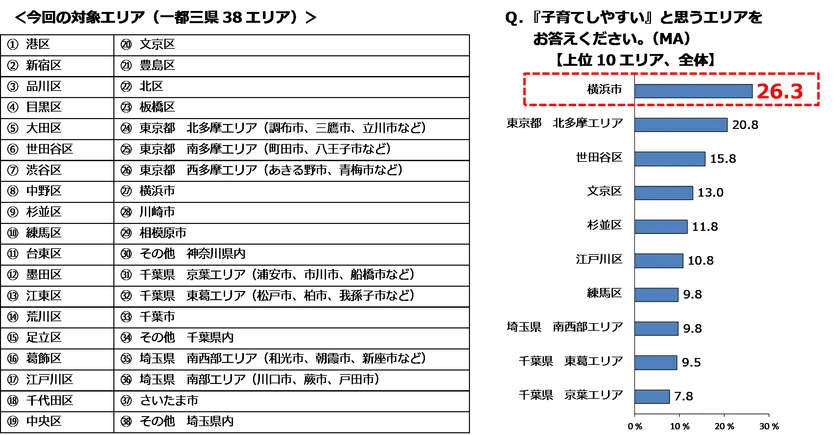 その結果、【横浜市】が「子育てしやすい」という項目において、38エリアで1位となりました(26.3%)。