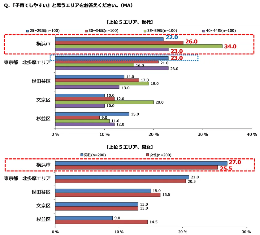 また男女別に見ても、男性が27.0%、女性が25.5%でいずれも横浜市が1位でした。男性目線、女性目線のいずれからも「子育てしやすい」と評価されていることは、特筆すべきことであると言えます。