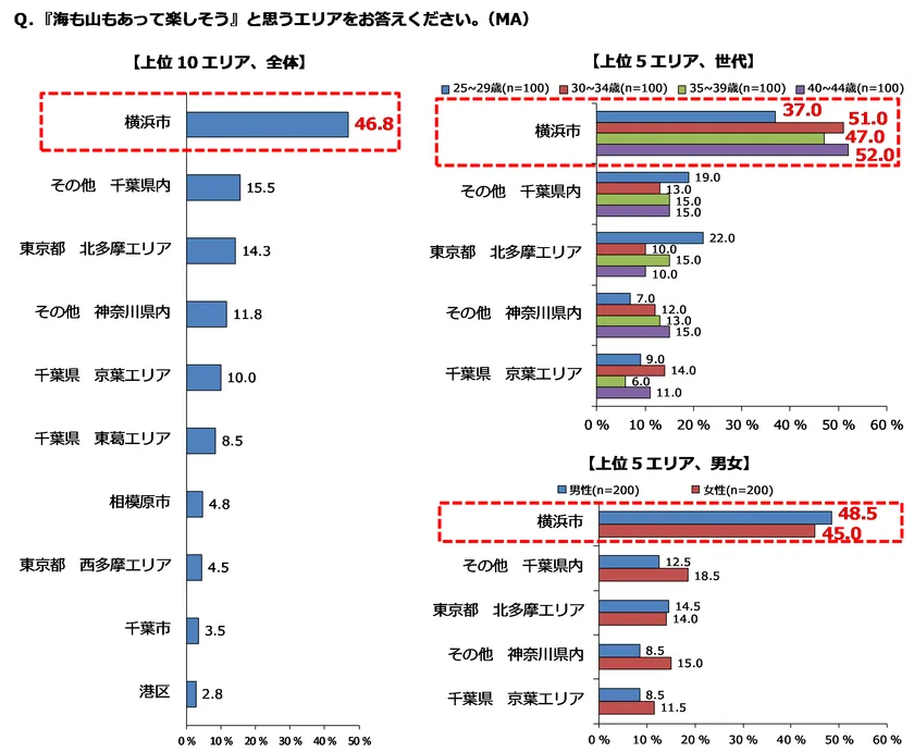 「海も山もあって楽しそうなエリア」の結果を見ると、全体では横浜市が46.8%で1位となり、2位の15.5%(その他千葉県内)と30%以上の差をつける結果となりました。世代別で見ると、25~29歳が37.0%、30~34歳が51.0%、35~39歳が47.0%、40~44歳が52.0%で、いずれの世代でも横浜市が1位でした。男女別で見ても、男性が48.5%、女性が45.0%で、いずれも1位となりました。