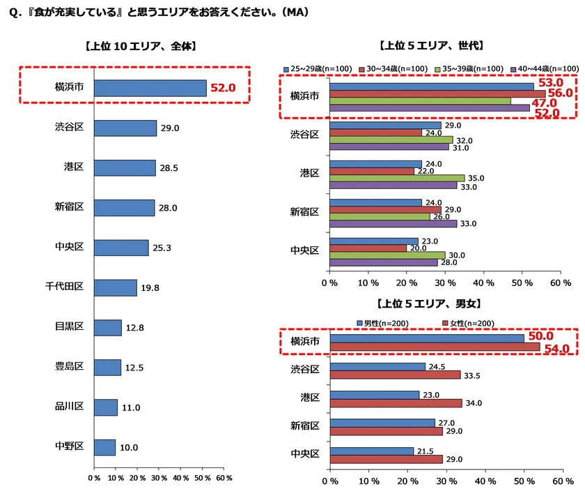 「食が充実しているエリア」の結果を見ると、全体では横浜市が52.0%で1位となりました。世代別で見ると、25~29歳が53.0%、30~34歳が56.0%、35~39歳が47.0%、40~44歳が52.0%で、いずれの世代でも横浜市が1位でした。また男女別で見ても、男性が50.0%、女性が54.0%で、いずれも1位となりました。人気の有名店がひしめく渋谷区や新宿区、青山・麻布・白金台などを有する港区、銀座・築地・日本橋を有する中央区など、名だたるエリアを抑えて横浜市が1位となったことから、食が充実しているエリアとして国内有数の評価を得ていると言えます。