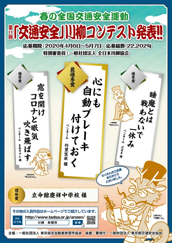 同コンテストは、春の全国交通安全運動の一環として交通安全の啓蒙を呼び掛けることを目的に、交通安全にまつわる川柳を、インターネット、葉書、都内の指定自動車教習所窓口で募集を行い、総数22,202句の作品が全国47都道府県から寄せられました。