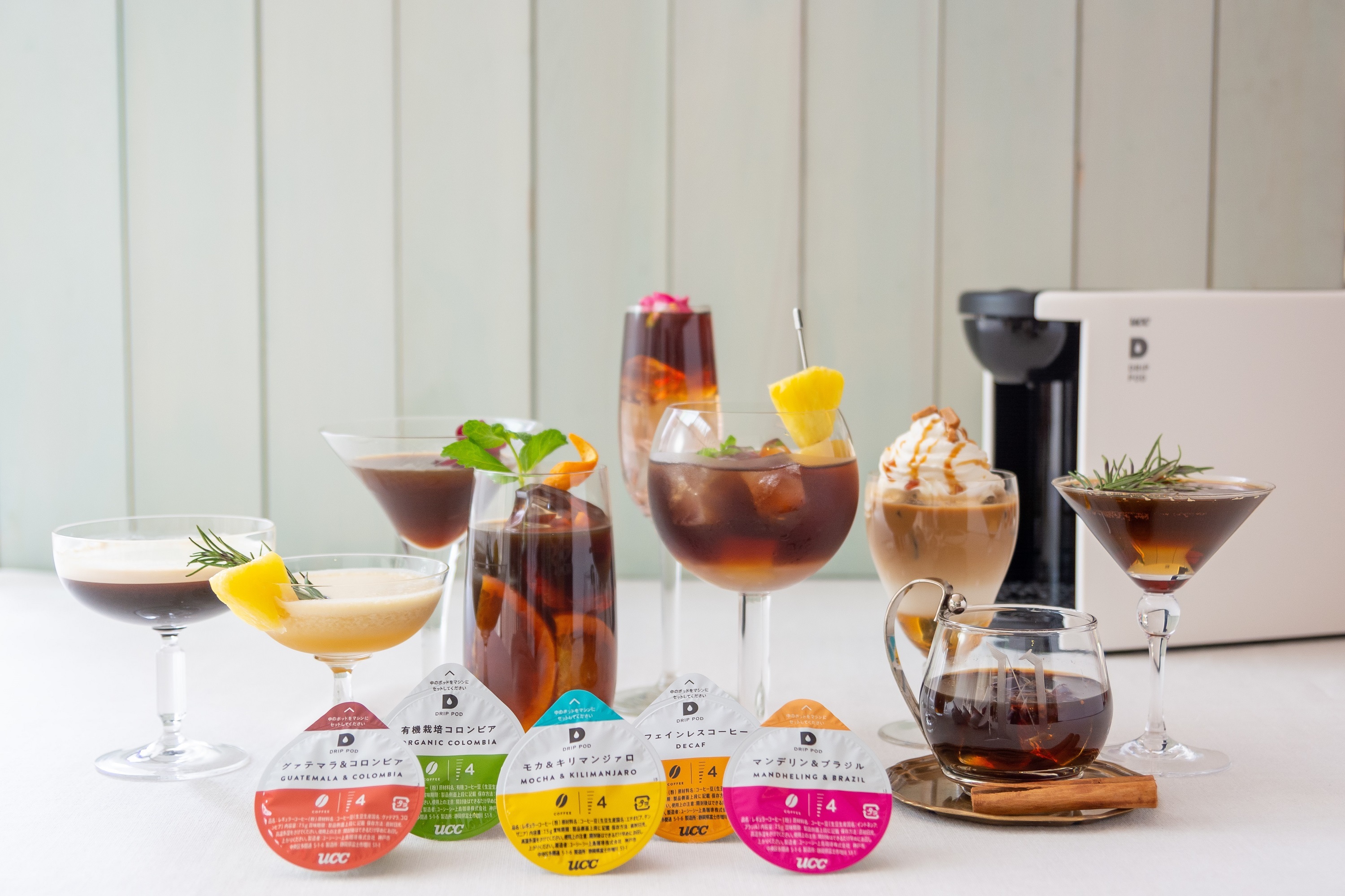 UCC上島珈琲株式会社(本社/神戸市、資本金/10億円、社長/朝田文彦)は、プロがハンドドリップで淹れたような本格的なコーヒーがいつでも味わえるドリップコーヒーシステム『ドリップポッド』を使って、なりたい気分やシーンに合わせたコーヒーモクテル※&カクテルが自宅で楽しめる『ドリップポッド 旅するコーヒーモクテルセット』を、2020年6月23日(火)より公式通販サイト「ドリップポッドストア」にて数量限定で発売します。