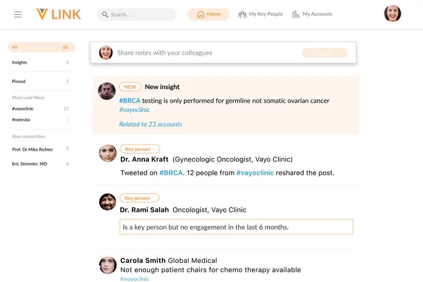 コマーシャルチームやメディカルチームは重要顧客やキーパーソンに関してAIによるインサイトの精選されたフィードが得られる