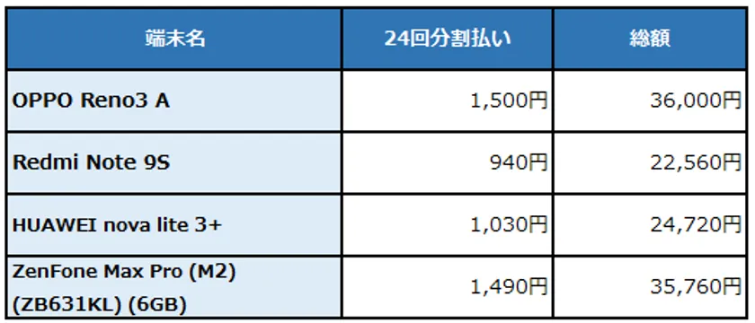 ※ 端末はすべて分割払い(24回)となります(支払期間25カ月・実質年率0%)。