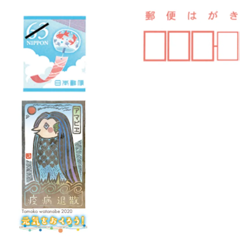 宛名面切手下にアマビエの版画を印刷した 「アマビエ暑中見舞いはがき」の取り扱い開始! はがきは地元氷川神社でご祈祷。
