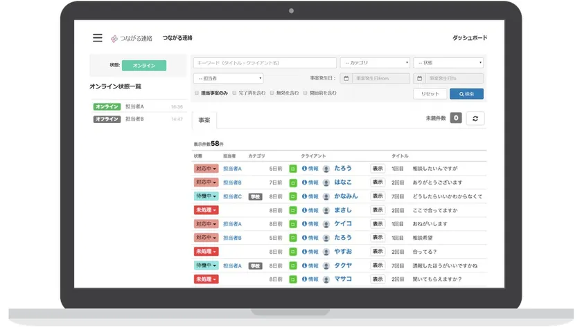 エースチャイルドが開発・運用しているマルチSNS相談プラットフォーム「つながる相談」はこれまで多くの官公庁・自治体・企業・団体等が実施する各種相談事業で採用された実績があります。「つながる相談」はパソコン・スマホ・タブレットのいずれかで利用可能となっており、機能として多様な状況に応じた自動応答メッセージ、豊富な統計データレポート、BOT機能などを備えた、相談業務に特化したクラウドサービスです。
