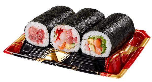 「北海道産帆立入り海鮮太巻」「まぐろたっぷり太巻」「北極圏生サーモン・アボカドチーズ入りサラダ太巻」のハーフ3本セット。いろいろな味を楽しみたい方におすすめです。