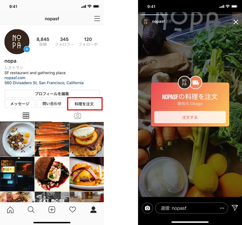 飲食店はInstagramのプロフィール画面に「料理を注文」アクションボタンを追加することで、Okage Go店外版で生成したテイクアウト・デリバリーの事前注文・事前決済が可能なメニューページへ遷移させることができます。