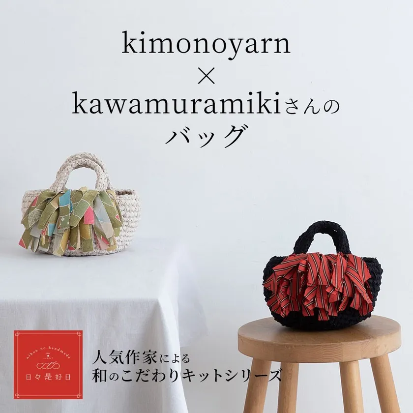 日本ヴォーグ社の人気作家による和のこだわりシリーズ「日々是好日」より、キモノヤーンのミニトートバッグキットが6月24日(水)に発売されました。バッグのデザインは、裂き編みの人気作家・河村美琴さん。わかりやすい解説と、購入者特典の動画付き。
