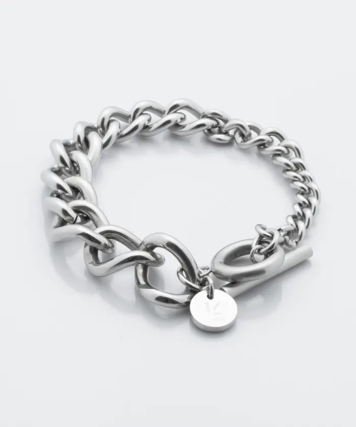 トレンドの重厚感あるチェーンブレスレットは、チェーン本体の滑らかな光沢が美しく、Tバー&マンテルは使い込むほど艶が増すマット仕上げ。