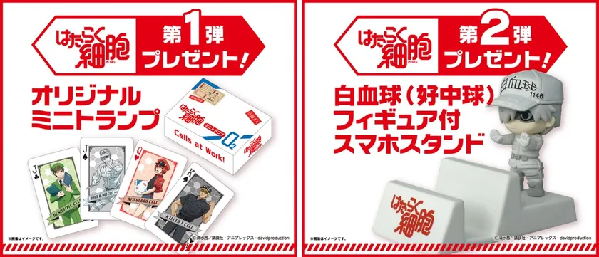 月刊少年シリウスで連載中の「はたらく細胞」は、体内細胞を擬人化した異色の漫画でコミック・アニメなど様々なメディアに展開し、大ヒットを記録。そして、ファン待望のTVアニメ「はたらく細胞」特別上映版の公開が決定。これに先駆けて、当社は“オリジナルミニトランプ”や“白血球(好中球)フィギュア付スマホスタンド”などの限定グッズが貰えるコラボキャンペーンを実施することにいたしました。2020年4月上旬には、新型コロナウイルス感染症(COVID-19)拡大の影響により、本キャンペーンは中止・延期をせざるを得ませんでしたが、2020年7月1日(水)から、一部内容を変更して本キャンペーンの実施を再開することにいたしました。