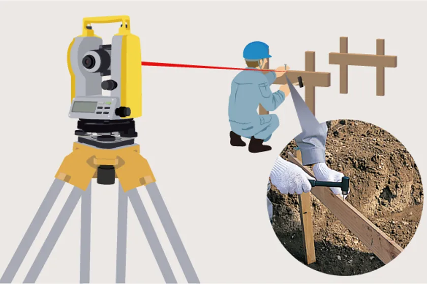 デジタルセオドライトとは、水平角と鉛直角を測る測量機で、直角を測る、直線を出す、勾配を設定する、柱が垂直に立っているかなど、屋外・屋内問わず幅広く建設・建築の工事現場で活用されています。