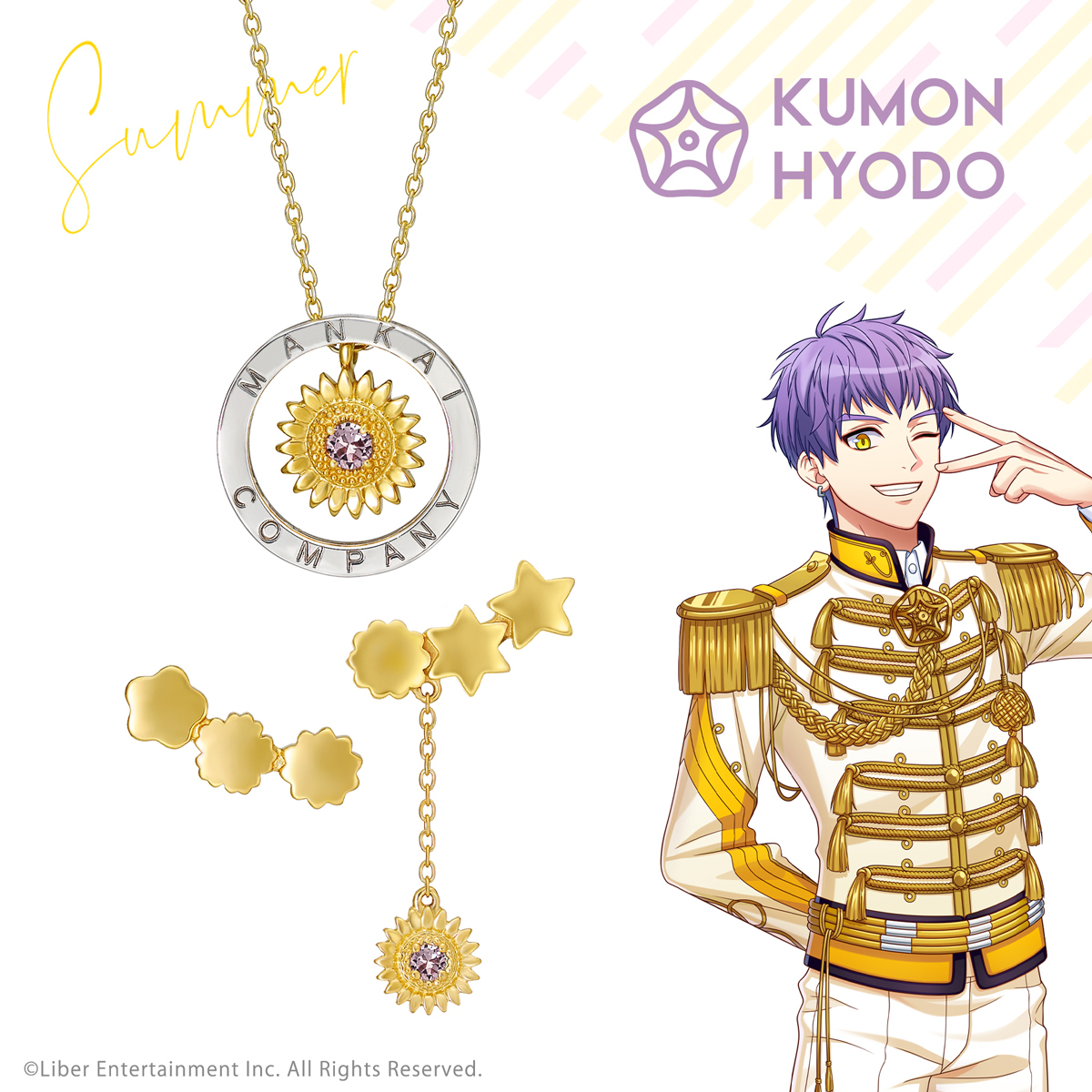 MANKAI COMPANYの刻印が入ったサークルと、夏組の劇団員をイメージしたひまわりモチーフで、個性豊かな劇団員がチームとしてまとまる様子をデザインしたネックレス。花の中央にはスワロフスキー・クリスタルが埋め込まれています。スワロフスキーは各劇団員のイメージカラーでご用意致しました。賑やかなコメディ劇が得意な夏組をイメージした、華やかなイエローのひまわりが胸元で輝きコーディネートの魅力を高めるアイテムに。サークルは取り外すことができ、2way使用可能です。