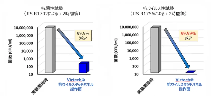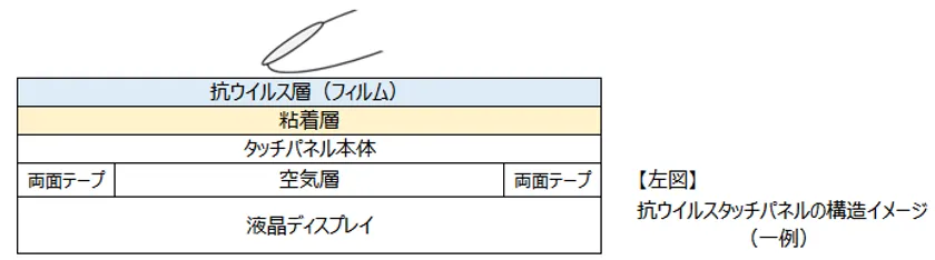 抗ウイルス材料には、東京大学先端科学技術研究センターでの研究成果に基づいて開発されたパナック株式会社の抗ウイルスフィルム - VIRtech(R)(ウィルテック)を使用しています。タッチパネル研究所では、このフィルムをタッチパネルの操作面に加工することで抗ウイルス機能を付与しています。