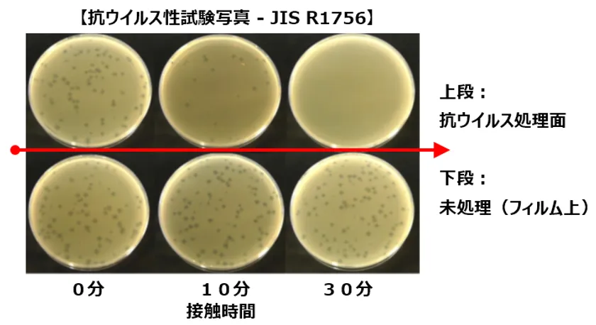 VIRtech(R)は、主成分である酸化銅(I)が放出する電子がウイルスを攻撃し、細胞への感染力をなくすことでウイルスを不活性化させます。抗ウイルス性試験(JIS R1756)では99.99%のプラーク数の減少を、抗菌性試験(JIS R1702)でも99.9%のコロニー数の減少が確認されています。