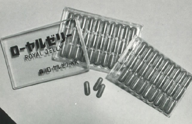 今回情報を募集するパッケージは、当社がローヤルゼリー製品の製造販売を始めた1958年以降に使用していたブラスチック製のケースで、中にカプセルを収めたトレイなどを入れていたもの、表面には社名などが刻印されています。 後には糖衣錠を入れたものも加わり、どちらも1972年ごろまで使用されていました。