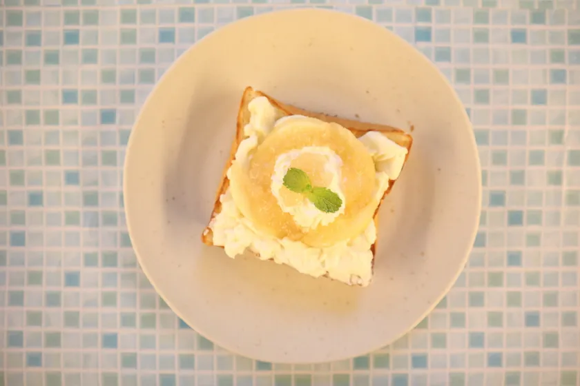 毎日の朝食に、、お子様と一緒に、、。「生」食パンのふわふわ食感と白桃ジャムが奏でる爽やかな味わいを口いっぱいに楽しめるレシピをご紹介いたします。
