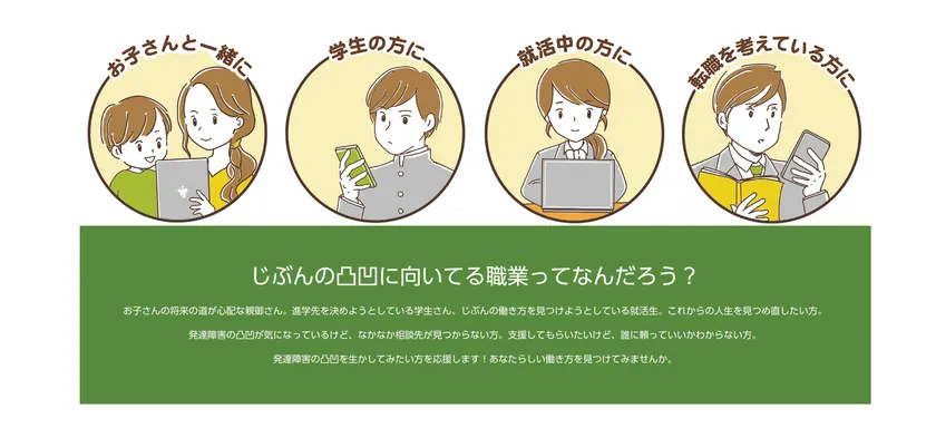 このサイトで、自分の凸凹を生かしながら「自分らしい生き方」や「多様な生き方」を発見してもらえればと考えています。進学や就職で悩んでいる方は、ぜひ一度ご利用ください。