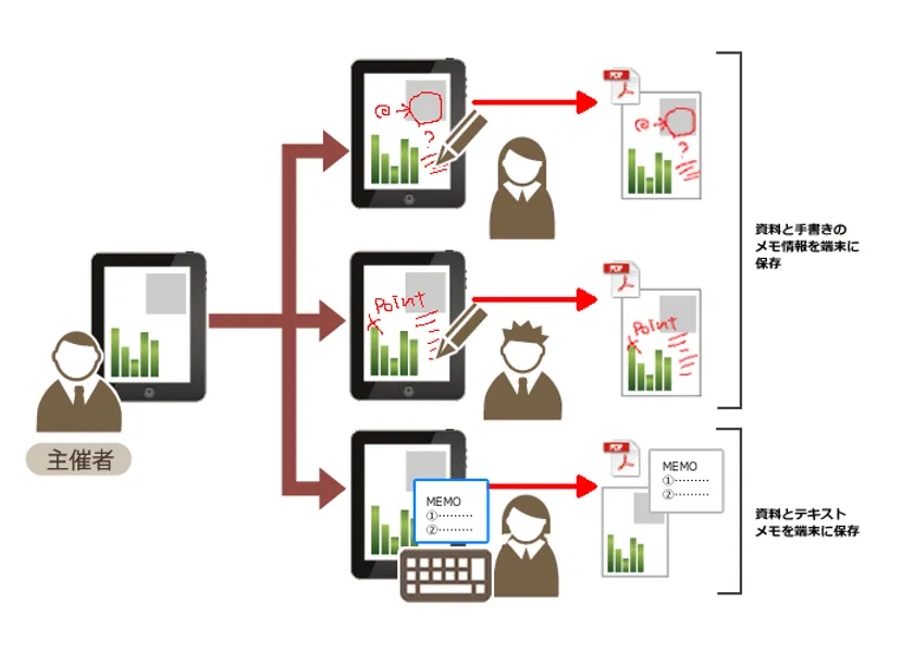 「SONOBA COMET Casual+」では、配布された会議資料上にメモを書き込むことができます。メモは、手書き、ソフトウェアキーボード、ハードウェアキーボードでの入力が可能なため、用途に応じて最適な入力方法を選択できます。またメモ情報は資料と共に各端末に保存し、会議終了後にタブレット端末上で閲覧できます。さらにPCとタブレット端末を接続し、メモ入りの資料をPCに取り出すこともできます。