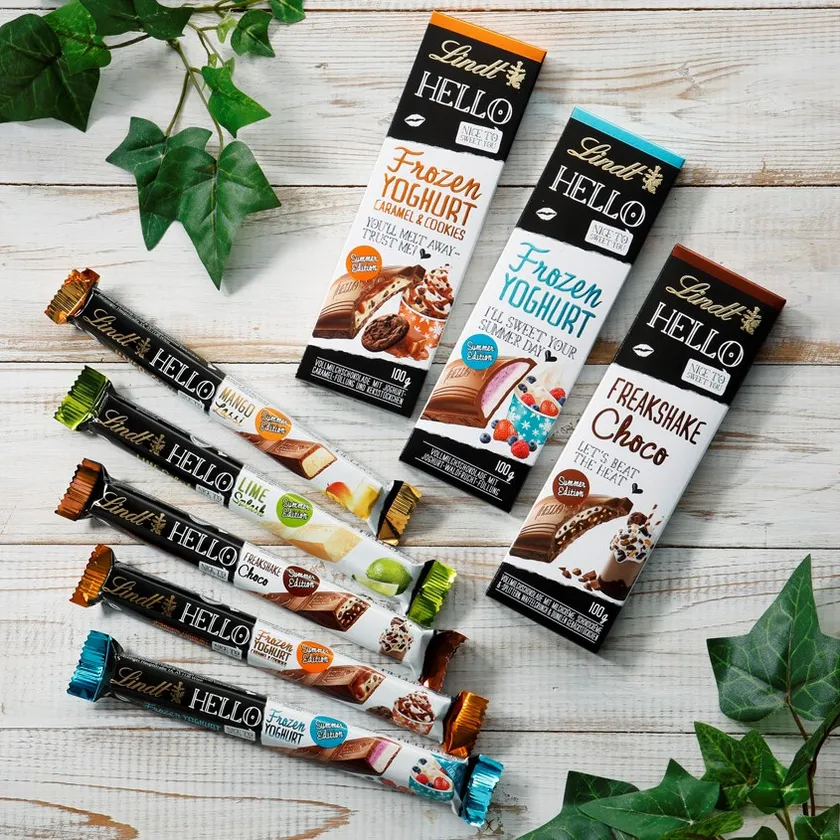 現代的なフレーバーが人気のチョコレート「HELLOハロー」に、スティック5種とタブレット3種、全8種のサマーエディションが登場します。日本初登場の「フリークシェイク チョコ」をはじめ、「フローズンヨーグルト」「フローズンヨーグルト キャラメル&クッキー」「マンゴーラッシー」「ライムスプラッシュ」など、オリジナリティあふれる夏らしいフレーバーが揃います。