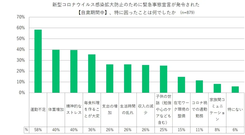 4月7日に政府から発令された緊急事態宣言が5月25日に解除されました。自粛期間中にそれまでの期間で「特に大変だったこと」の上位は運動不足(58%)、体重増加(40%)、精神的なストレス(40%)となり、健康や身体への負担が大きかった様子が伺えます。