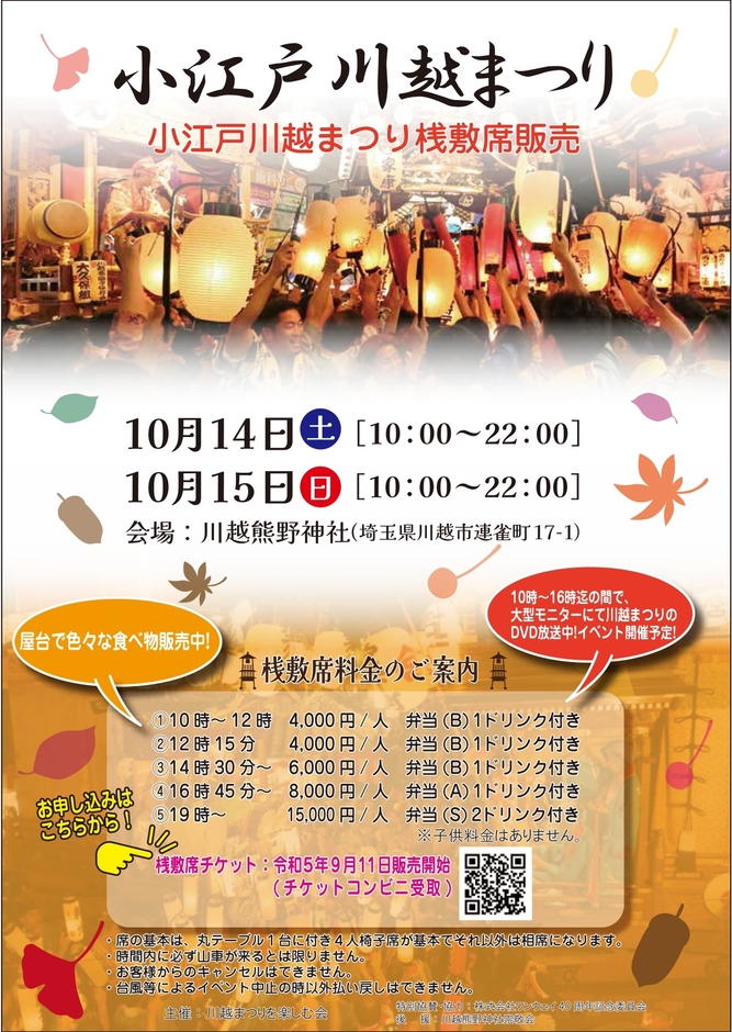 川越まつりを楽しむ会主催、『小江戸川越まつり』が2023年10月14日 (土) 、10月15日 (日)に川越熊野神社西側(埼玉県川越市連雀町17-1)にて開催されます。桟敷席のチケットがカンフェティ(運営:ロングランプランニング株式会社、東京都新宿区、代表取締役:榑松 大剛)にて9月11日(月)9:00より発売開始です。