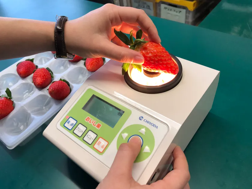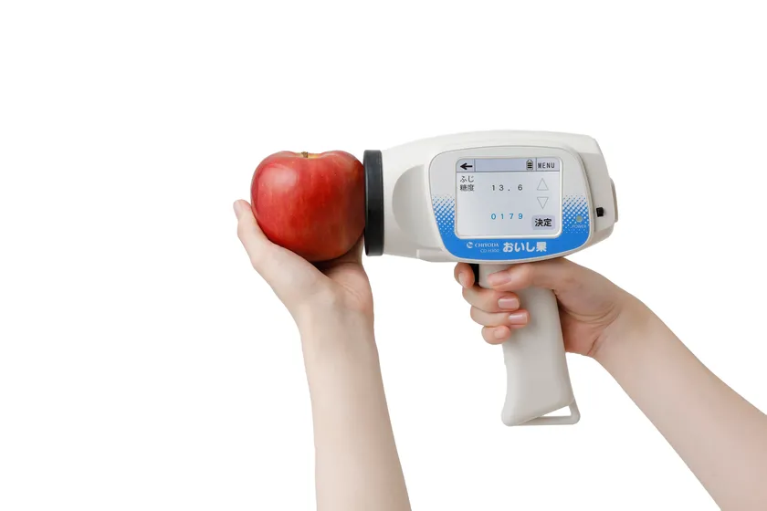 当社が製造・販売する非破壊測定器の商品名で、果実の表面に当てるだけで糖度が計測できます。果汁を絞る必要が無いため、作物を傷つけず、収穫前の作物をそのまま測ることもでき、出荷の際にはすべての作物を計測してそのまま出荷することも可能です。出荷時期を決めたり、出荷物の品質を確認して販促に役立てたりと、さまざまな使い道があります。
