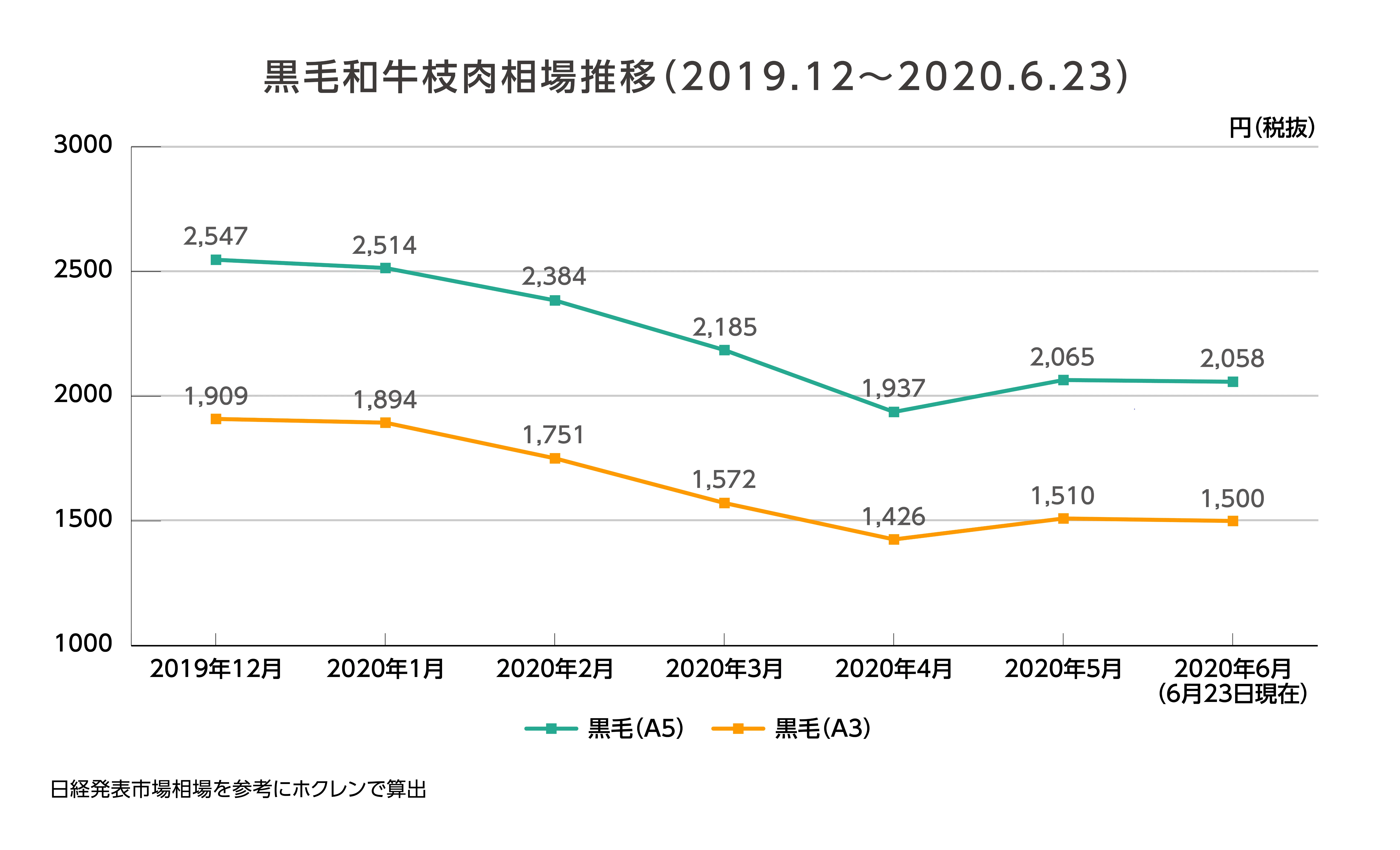 しかし、新型コロナウイルス感染拡大、緊急事態宣言による全国の飲食店等の休業や営業自粛により、高級部位を中心とした国産牛肉の需要が減少、消費回復にも時間がかかることが予想されるほか、アフターコロナのライフスタイルの変化による外食需要の減退も予測されます。需要回復が遅れると取引相場が低迷し、和牛だけでも昨年12月度と比較して、市場価格は約8割程まで落ち込んでいます(上図)。