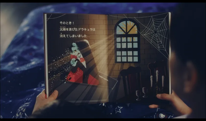 お母さんが子供にドラキュラの絵本を読み聞かせをしているシーン。