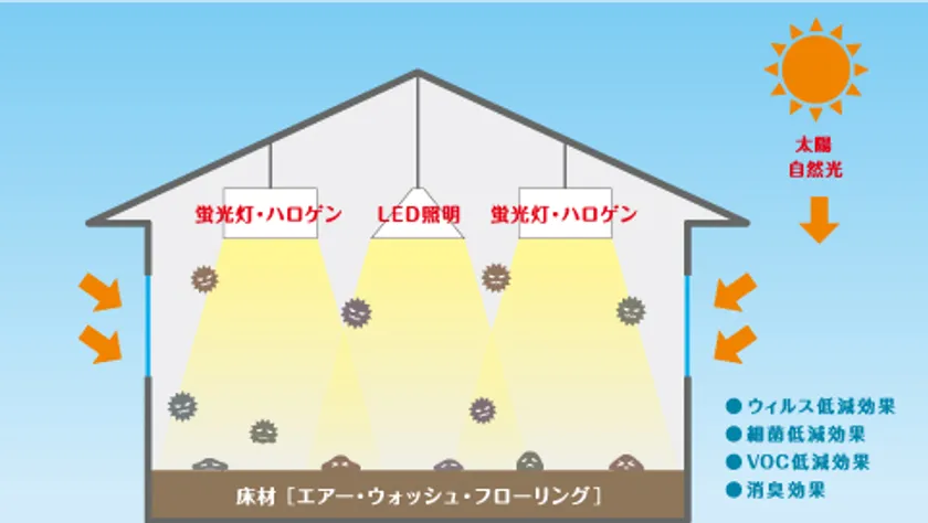 「エアー・ウォッシュ・フローリング」とは、「可視光型光触媒」の技術を用いて、室内に漂うウイルスや菌を洗い流すことができるという機能をもった業界初の複合フローリング材です。