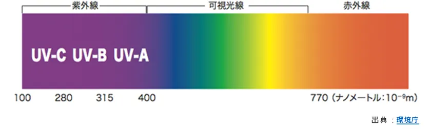■太陽からの光は、波長により【赤外線】・【可視光線】・【紫外線】の3つに分けられます。紫外線は、太陽の光の中では波長が短く、一番エネルギーが高い光です。紫外線はその中でも、波長によって「UV-A」「UV-B」「UV-C」の3つに分類されます。その紫外線のなかでもよりUV-Cは短波長の100~280nmの深紫外線が除菌に適しているといわれる領域になります。