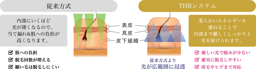 遠赤外線領域が多い波長域を使用することで、光の到達点が広く、従来の脱毛方法より確実に成長期の毛にアプローチすることができます。また、肌表面ではなく、肌内部に光が浸透するため、今までお手入れが難しいとされていた産毛などの細かい毛やヒゲなど濃い毛までしっかりお手入れすることが可能です。