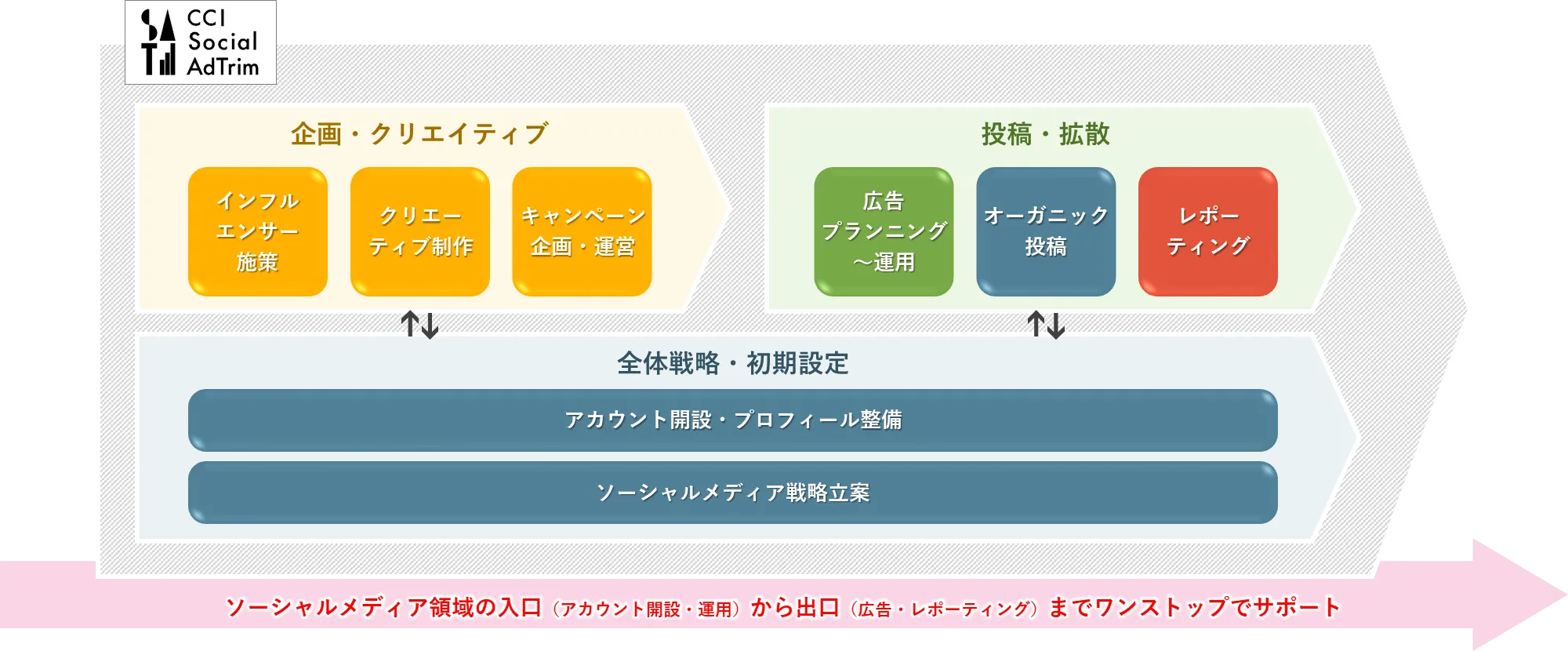 CCIはこれまでもソーシャルメディア領域において広告をはじめとする各種サービスを展開してまいりましたが、 ”CCI Social AdTrim”では、当社社員であり、自身のSNSアカウントでフォロワー数1万人以上を獲得しているSNS運用経験者がコンサルタントとして参加し、プラットフォームごとに最適化されたプランニングによって、入口から出口までの必要施策をワンストップでサポート、企業のSNSにおける最適なコミュニケーションを実現します。